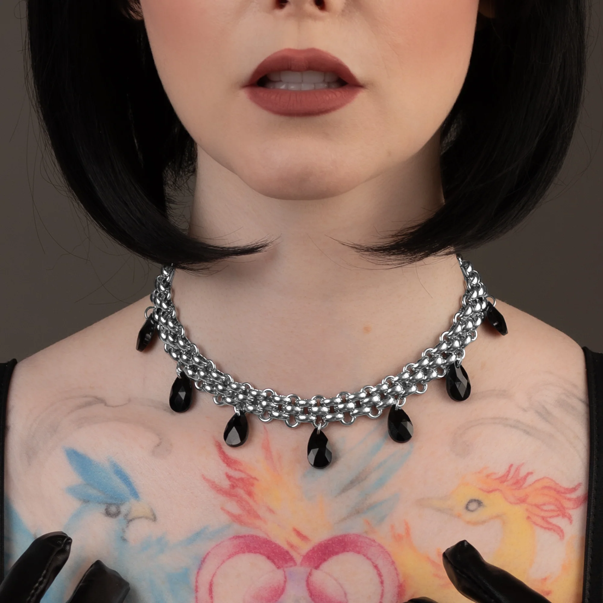 Unveil your dark elegance with our Gothic Teardrop Choker. Each delicate black glass teardrop jewel captures the essence of mystery and allure, elegantly suspended on a robust stainless steel, silver coloured chainmail chain. This exquisite piece, available in three sizes with an optional 4 inch adjuster chain, adapts seamlessly to your desired fit. Presented in a velvet pouch, it ensures a touch of sophistication and gothic charm, perfect for any occasion. Elevate your style with this unique accessory that promises to be the highlight of your ensemble.